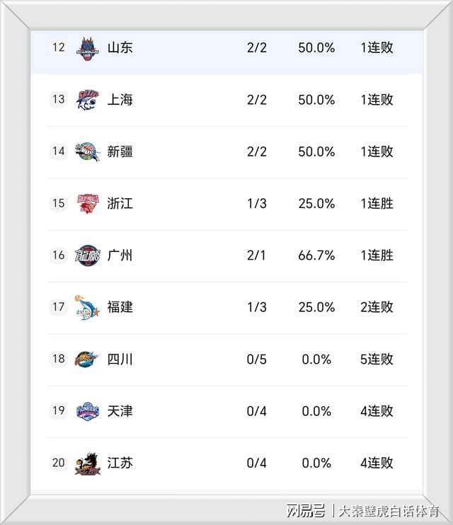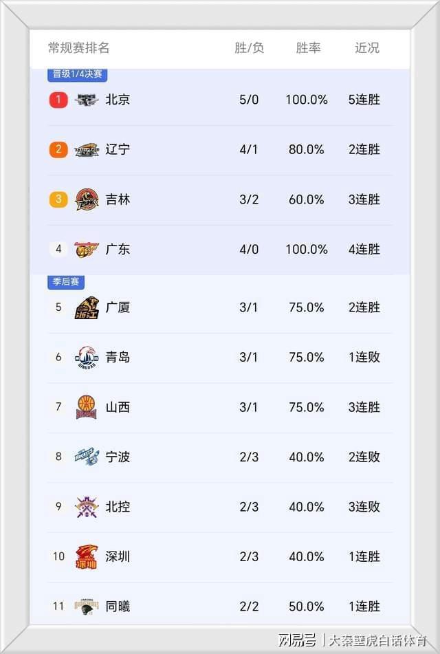 另外两场比赛,吉林队主场以82-77险胜宁波队; 山东队主场92-95、3分惜败在深圳队面前。 这场比赛,国手高诗岩手感有所回升,拿到13分5板5助的全面数据,只是球队功亏一篑,无缘胜利。 随着4场比赛的落幕,最新积分榜如下: ①、由于第五轮广东队和广州的德比战仍未开始,北京队成为联盟唯一5连胜球队,高居排名榜首; ②、辽宁队4胜1负拿到2连胜,排名暂时升至第2位; ③、全华班出战的四川男篮,成为联盟迄今为止唯一5连败的球队。 对此排名,大家怎么看?