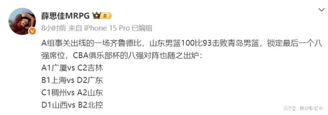 | 2025-26赛季CBA季中杯第一阶段的比赛正式落下帷幕,随着山东队击败青岛队,成功拿到CBA季中杯最后一张淘汰赛入场券,本届CBA季中杯淘汰赛8强正式产生。广东、山西、吉林、上海、浙江、北控、山东以及广厦悉数晋级,而辽宁、新疆以及北京等队则被淘汰出局。与此同时,CBA季中杯淘汰赛对阵局势也正式出炉,广厦将大战吉林,广东则迎战上海。