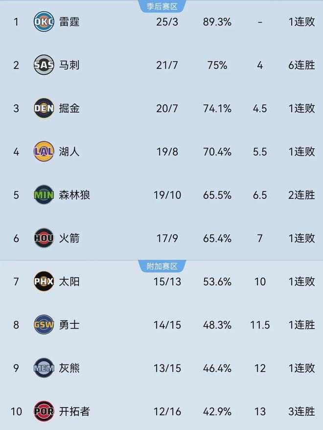本赛季至今,湖人以19胜8负位列西部第四,落后第三的掘金1个胜场,领先第五的森林狼1个胜场,距离榜首的雷霆多达5.5个胜场。