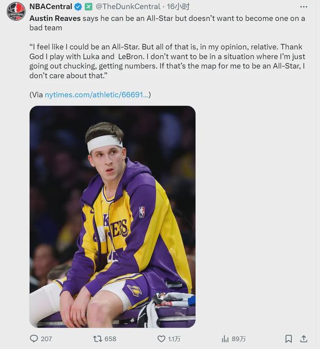 北京时间10月1日,距离常规赛揭幕战还有21天。湖人后卫里夫斯接受采访时说道:“我觉得自己完全有能力入选全明星,但我不想靠刷数据进全明星。我不想处在那种只能不断出手、只能刷数据的环境,那样的全明星我根本不在乎。”