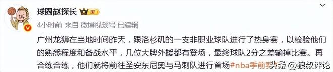 北京时间10月4日,根据媒体人赵探长的报道,广州龙狮在当地时间昨天跟洛杉矶当地的一支球队进行了热身赛,以检验他们的熟悉程度和备战水平,几位大牌外援都有登场,最终球队2分惜败。