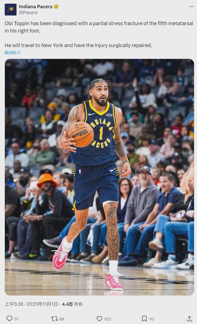 | 北京时间11月1日,NBA杯(季中赛)小组赛正式开打:老鹰128-108大胜步行者。本赛季至今,步行者0胜5负和篮网并列东部倒数第一。屋漏偏逢连夜雨,步行者官方今日宣布:奥比-托平被诊断出右脚第五跖骨部分应力性骨折。