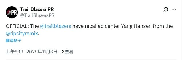 |   北京时间11月3日,开拓者官方宣布召回杨瀚森,根据此前报道,他将随队参加明日对湖人的比赛。队记Mike Richman在播客上谈到了杨瀚森的话题。他指出开拓者下放瀚森到发展联盟,有可能只是训练而不参加比赛,随后他分析了其中的原因。以下是Richman播客关于瀚森的内容——