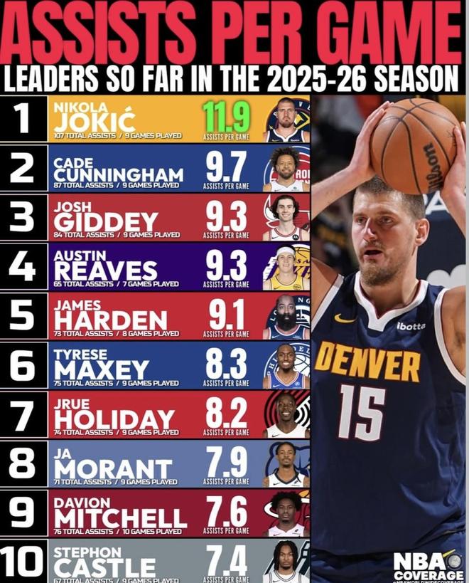| 美国媒体nba worldwidecoverage晒出了2025-2026赛季至今的场均助攻榜单,约基奇、高居榜首,场均11.9次助攻,把队友都“喂饱”了。坎宁安、吉迪、里夫斯、哈登等后面一长串组织核心也都上榜,分布在东西部多支球队。 这个榜单的数据截至北京时间2025年11月10日,只看这阶段的表现,就能大概感受到谁在真正掌控球队进攻节奏。接下来就按排名,把这10名球员的数据一一列出来。