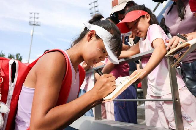2025年中网ITF国际青少年网球巡回赛,孙心然为小球迷签名。