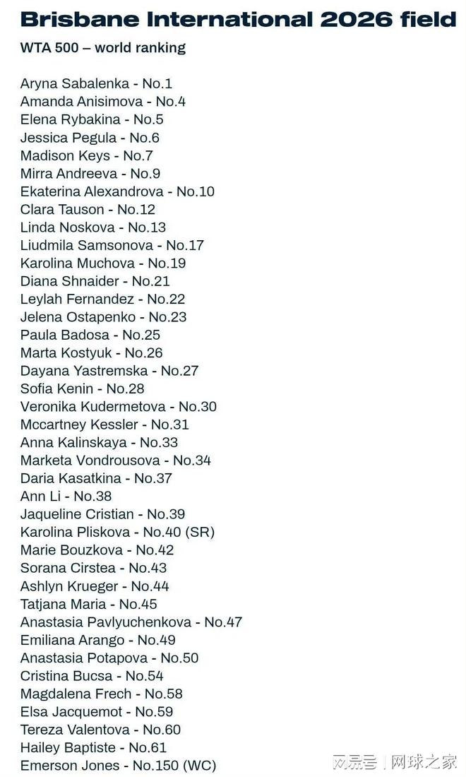 布里斯班赛参赛阵容公布:萨巴梅总领衔!