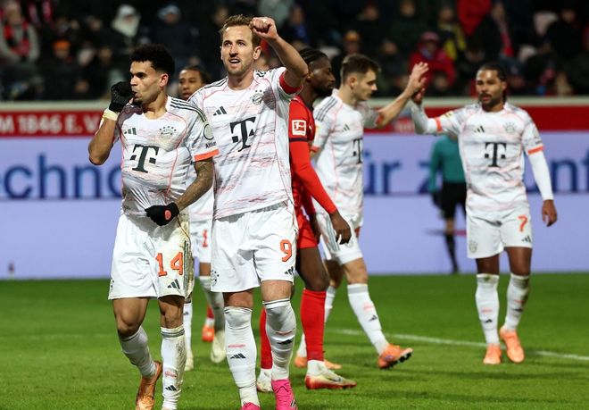 比赛刚刚开打第12分钟,拉菲尼亚就为巴萨赢得一粒点球,并且亲自操刀命中,帮助球队取得了1-0的梦幻开局,半场结束之前,维加飞铲亚马尔被主裁红牌罚下,更让黄潜雪上加霜,下半场亚马尔门前乱战中抽射建功,将领先优势扩大到了2球,虽然少一人作战的黄潜最后一度形成围攻之势,但靠着门将霍安加西亚的神勇发挥,巴萨成功零封了对手。 海登海姆0-4拜仁慕尼黑 作为本赛季欧洲足坛表现最出色的球队,拜仁慕尼黑上一轮德甲爆出冷门,在安联球场被积分榜垫底的美因茨逼平,不过南大王仍然以不败的战绩,高居积分榜第一,牢牢将命运掌握在自己的手中,此役客战积分榜倒数第二的海登海姆,南大王肯定不想重蹈覆辙,全取三分也就成为了他们唯一的目标。