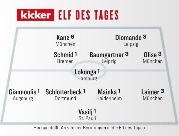 前锋:凯恩(拜仁)、扬-迪奥曼德(莱比锡) 中场:施密德(不莱梅)、洛孔加(汉堡)、鲍姆加特纳(莱比锡)、奥利塞(拜仁) 后卫:吉安努利斯(奥格斯堡)、施洛特贝克(多特)、迈因卡(海登海姆)、莱默尔(拜仁) 门将:瓦西里(圣保利) |