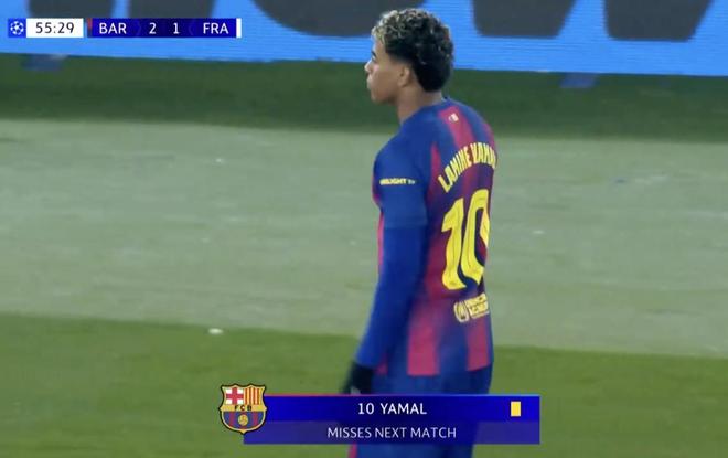 | 欧冠联赛阶段第6轮,巴塞罗那主场对阵法兰克福,下半场亚马尔领到一张黄牌,这位巴萨边锋将因累计黄牌停赛缺席下一轮欧冠比赛。