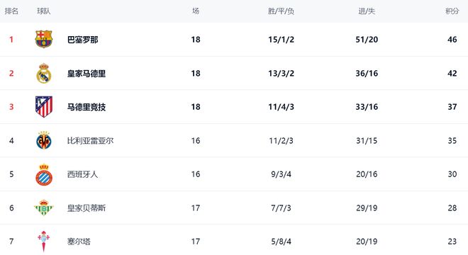 在积分榜上,巴萨以46分排名榜首。第2名的是皇马,战绩是42分。前2的差距只有4分,巴萨占据优势。马竞赢球之后,总积分是37分,比巴萨少了9分,冲击冠军希望比较渺茫。比利亚雷亚尔依然是35分,排名第4。第5的是西班牙人,拿到30分。皇家贝蒂斯以28分排名第6。 |