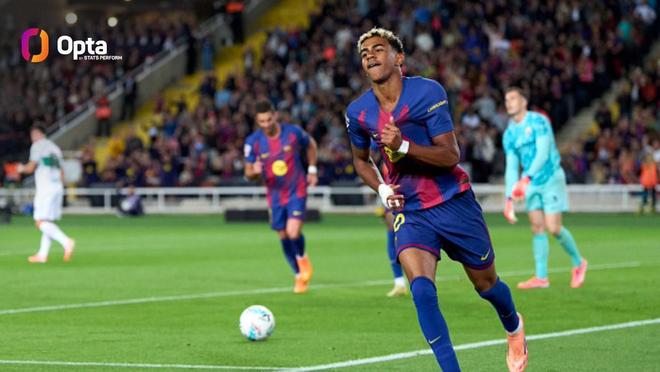 根据Opta的统计,本场比赛的进球是18岁的亚马尔西甲出战80场所打进的第17球,在进入21世纪之后,只有姆巴佩在年满19岁之前的五大联赛进球数(23球)比亚马尔更多。 亚马尔本赛季至今代表巴萨出战了9场比赛,其中8次首发,贡献4粒进球和5次助攻。  |