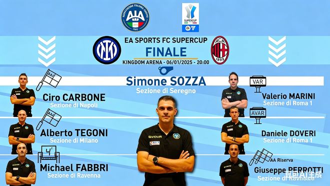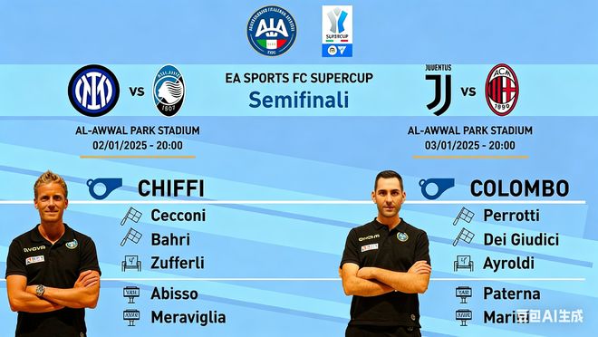而根据《体育报》的报道:官方尚未公布超级杯决赛的裁判人选,是因为他们要等到半决赛结果出炉之后再根据情况指派。如果那不勒斯进了决赛,那么决赛的主裁判将是科隆博(Colombo)【科莫】;而反之如果那不勒斯输了,那么圭达(Guida)【那不勒斯】将会执法此后进行的对决。