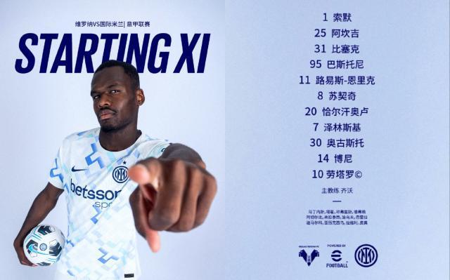 国际米兰阵容:佐默/阿坎吉、比塞克、巴斯托尼/路易斯·恩里克、苏契奇、恰尔汗奥卢、泽林斯基、奥古斯托/博尼、劳塔罗  |