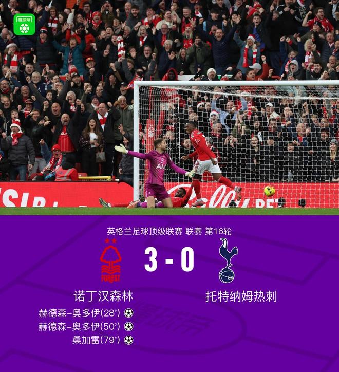 北京时间12月14日,英格兰足球超级联赛第16轮,诺丁汉森林坐镇主场迎战托特纳姆热刺。比赛中,桑加雷前场抢断格雷,助攻赫德森-奥多伊打空门得分。此后,桑加雷再次送出助攻,赫德逊-奥多伊吊射世界波打进第二球。比赛进入尾段,赫德森-奥多伊送出助攻,桑加雷不停射门得分。最终,诺丁汉森林以3比0战胜热刺,全取三分。 关键事件