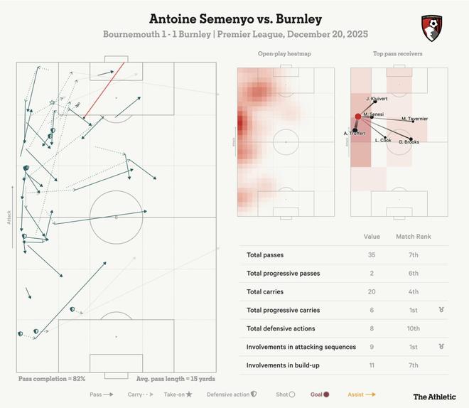 当比赛进行到下半场中段,伯恩茅斯迎来了当天下午第12次打破僵局的机会,对手是伯恩利。 乔什-劳伦特在禁区边缘解围时脚下一滑,皮球滚到了塞门约脚下,他果断将球扫射入网,帮助球队取得1-0领先。此时活力球场的欢呼声不仅是喜悦,更夹杂着如释重负的情绪。 这是塞门约本赛季的第8个联赛进球,也是他在经历连续7场进球荒后,连续第二场取得进球。再加上3次助攻,他已经直接参与了伯恩茅斯本赛季26个英超进球中的11个,占比达到42%。在英超中,只有曼城的哈兰德(56%)以及布伦特福德的伊戈尔-蒂亚戈(46%)在球队进球中的占比更高。 伯恩茅斯主帅伊劳拉在赛后评价这场最终1-1战平伯恩利的比赛时说道:“(塞门约)对我们来说非常重要。他不仅在数据层面帮助球队,在很多方面都贡献巨大。我认为他一直非常稳定,跑位也在不断进步。即便最近那段时间没有进球,他依然非常有威胁。” 伊劳拉的这番话,是在回应有关塞门约未来去向的问题。 The Athletic记者大卫-奥恩斯坦上月报道称,这位加纳国脚的合同中包含一条6500万英镑(约合8700万美元)的解约金条款,该条款可在即将到来的冬季转会窗口被激活。明年夏天解约金数额将下降,但即便如此,伯恩茅斯仍能获得可观利润——毕竟他们是在2023年1月以仅1050万英镑的价格从布里斯托尔城签下他的。 伊劳拉为优秀球员提供成长平台的能力,毫无疑问是塞门约能够打出高水平表现的重要因素。但问题在于:这位25岁的前锋究竟是因为伯恩茅斯的体系而大放异彩,还是他的个人能力足以让他在其他环境中同样制造威胁? 从下面的球员数据面板可以看出,在周六对阵伯恩利的比赛中,塞门约几乎参与了伯恩茅斯前场的所有进攻组织。