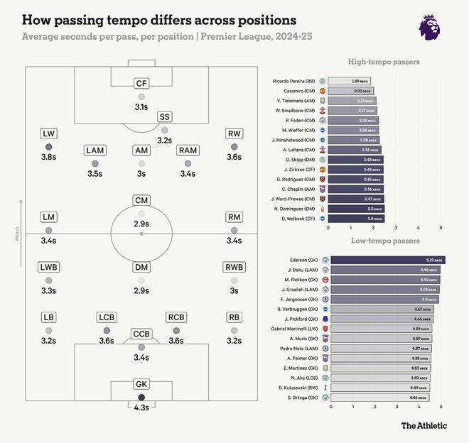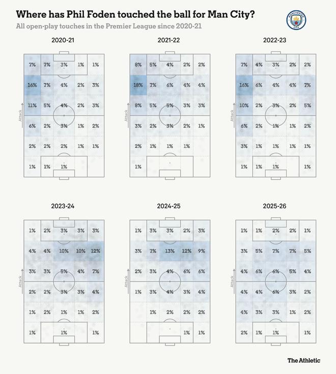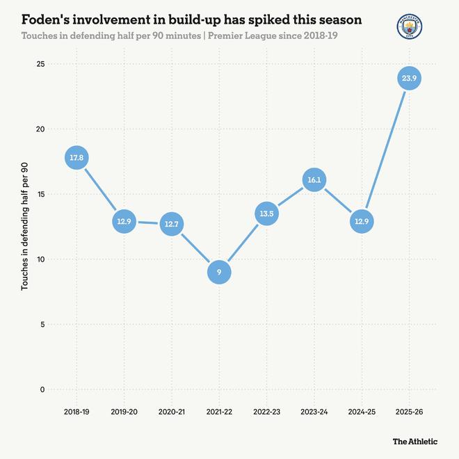 如果说瓜迪奥拉想教给福登一件事,那就是理解时机。何时是盘带的正确时机,何时又该放缓节奏。何时该冒险一搏,何时该控制局面。那就是理解“La Pausa”(战术停顿)——这个指导原则要求你放慢节奏以操控对手。可以想见,这对一个来自斯托克波特的小伙子来说,可不是个熟悉的词儿。 瓜迪奥拉接手时,福登是个16岁的孩子,刚因作为英格兰U17世界杯夺冠阵容的核心而一举成名。问题在于,在曼城一线队,10号位属于大卫-席尔瓦和凯文-德布劳内。 在瓜迪奥拉的球队中,中场中路的位置是留给教练组成员称之为“干净”的球员的。即那些懂得冷静构建攻势、感知比赛脉搏的球员。等待正确时机,完全掌控,绝不被迫犯错,当然更无谓失误。福登初出茅庐时,拥有炫目的左脚和敏锐的头脑,但他是一团能量与想象力的结合体,尚未准备好承担中路角色所需的冷静决策。 瓜迪奥拉选择让他从两个边路逐步融入球队。在那里,他将学习比赛的门道,并观察大师们如何工作,为将来某一天接管10号位做好准备。 几乎没人怀疑他能胜任这个角色。这只是时间问题。进入一线队四年后,他刚满20岁。无需着急。他积累的比赛越多,获得的经验和比赛智慧也就越多。 如今,在身经342场比赛后,他正散发出一种掌控力,显示出他完全清楚在比赛的每个阶段自己应该做什么。 他有过几次担任中路的时期,但他必须等到本赛季,瓜迪奥拉才相信他已准备好完全承担这份责任。十年循序渐进的指导,最终促成了曼城所期望的“完全体”福登的出现。 英格兰队主教练托马斯-图赫尔已确信他属于中路,在那里,他对比赛的影响力比以往任何时候都大。罗德里本赛季长期缺阵可能是一个因素,但如下图所示,福登回撤接应、帮助曼城破解对手高位逼抢的次数也达到了前所未有的程度。