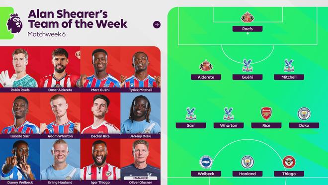 雷速体育9月30日讯 英超名宿阿兰·希勒为英超官方评选了第6轮比赛的最佳阵容。 帮助水晶宫战胜利物浦的中场球员亚当·沃顿得到希勒极高评价,格拉斯纳成为周最佳主帅,哈兰德、赖斯等人入选。 罗宾·罗埃夫斯(桑德兰): 力拒对手进球,6次扑救帮助桑德兰1-0取胜。 奥马尔·阿尔德雷特(桑德兰): 一记精彩的头球制胜,他在后防线上的表现也堪称坚如磐石。 格伊(水晶宫): 从第一分钟到最后一分钟都表现出色,甚至还送出了助攻,帮助水晶宫赢得比赛。难怪利物浦想要签下他! 泰里克·米切尔(水晶宫): 他让萨拉赫整场比赛都碌碌无为。 伊斯梅拉·萨尔(水晶宫): 伤愈复出,状态神勇!他各项表现都非常出色,多次精彩跑动,并首开纪录。 亚当·沃顿(水晶宫): 在与利物浦强大的三叉戟——麦卡利斯特、赫拉芬贝赫和索博斯洛伊——的对抗中,沃顿无疑是完胜。 赖斯(阿森纳): 他无处不在,先是回防雅各布·墨菲,用精彩的封堵阻止了他,然后又用一记精彩的传中为阿森纳扳平比分。 多库(曼城): 在曼城5-1大胜伯恩利的比赛中,他先是制造了首开纪录,随后又送出了助攻。 维尔贝克(布莱顿): 替补出场、梅开二度,帮助布莱顿赢得了比赛。即使已经34岁高龄,维尔贝克依然状态强劲。 哈兰德(曼城): 又进了两个球,还策动了一个进球,他冲击下一座金靴奖的路上似乎无人可以阻止。 伊戈尔·蒂亚戈(布伦特福德): 两粒精彩的进球重击了曼联。 格拉斯纳(水晶宫): 说他彻底改变了水晶宫都不足以称赞他。格拉斯纳的表现简直令人惊叹,他的球队完全配得上这场对阵卫冕冠军的精彩胜利。 |
