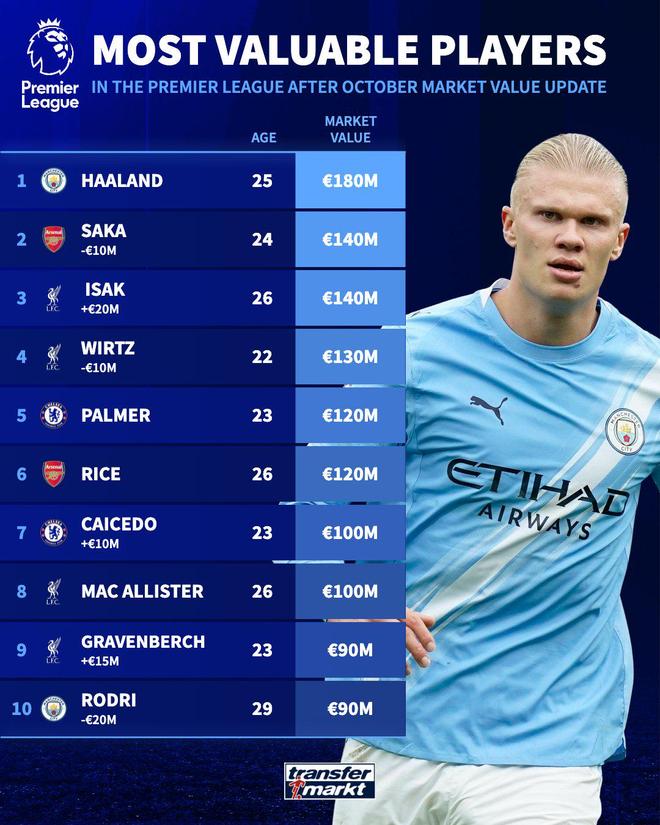 雷速体育10月17日讯 在刚刚更新的德转最新英超一期身价中,曼城队内福登和罗德里均下跌2000万欧元,同期英超下跌最多,两人已经跌出亿元先生俱乐部。 目前福登最新身价8000万欧元,罗德里最新身价9000万欧元,曼城队内目前仅剩哈兰德一位亿元先生,这位挪威前锋以1.8亿欧元领跑英超身价榜单。 |