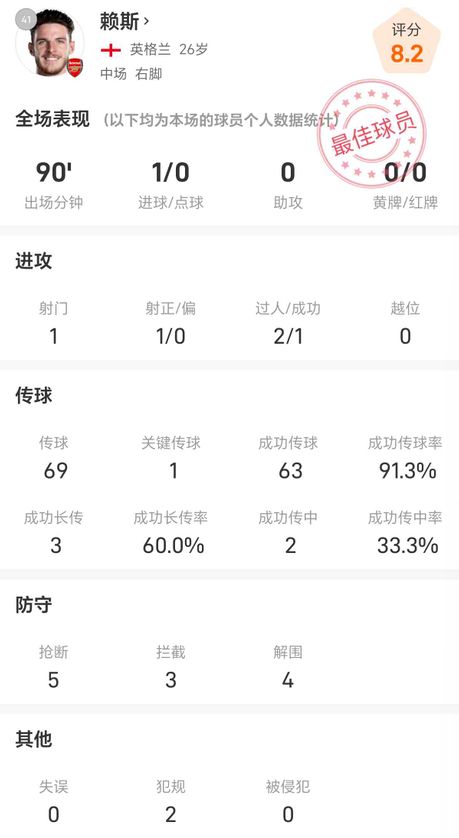 | 雷速体育11月2日讯 英超第10轮,阿森纳2-0伯恩利,本场比赛,赖斯首发出场,他全场比赛数据如下: 出场90分钟,射门1次,打进1球 尝试过人2次,成功1次 传球69次,传球成功率91.3% ,关键传球1次 成功长传3次,长传成功率60% 抢断5次,拦截3次,解围4次 赖斯进球GIF: |