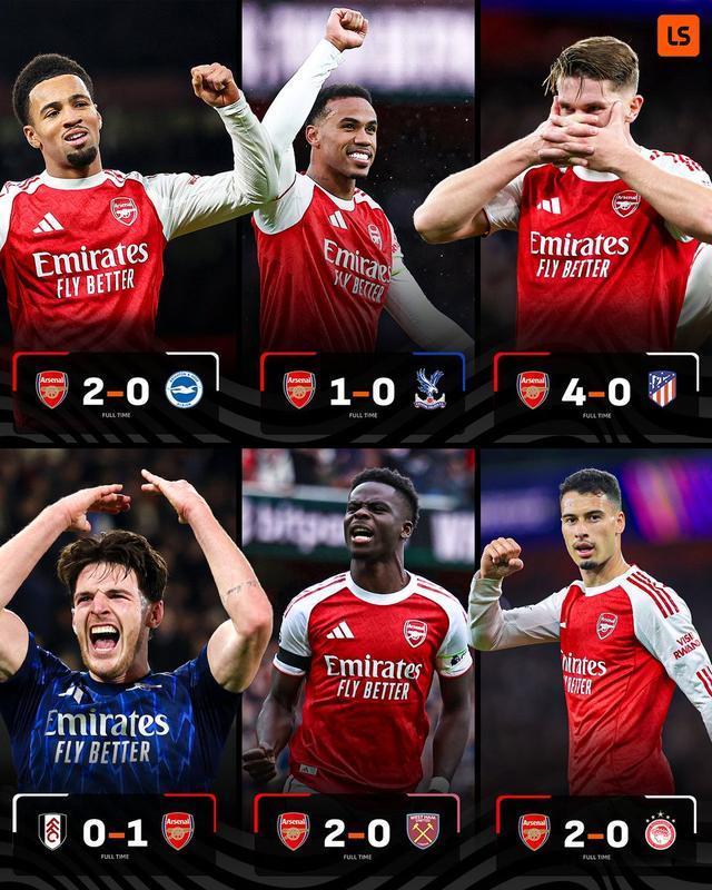 欧冠2-0奥林匹亚科斯 英超2-0西汉姆联 英超1-0富勒姆 欧冠4-0马德里竞技 英超1-0水晶宫 英联杯2-0布莱顿 此外,阿森纳已经取得各项赛事8连胜,本赛季至今唯一失利是英超第3轮客场0-1不敌利物浦。 |