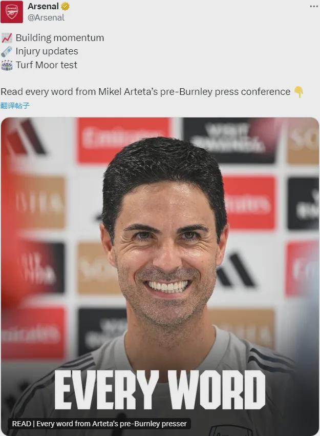 阿尔特塔在赛前新闻发布会上谈到了球队的伤病问题,咱们简单看看阿森纳主帅的发言。