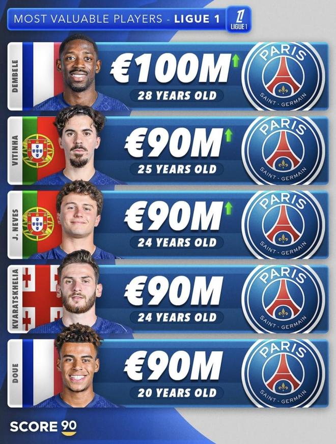 法甲Ligue1登贝莱(Ousmane Dembélé) | 法国 | 28岁 | 1.0亿欧元 维蒂尼亚(Vitinha/VítorFerreira) | 葡萄牙 | 25岁 | 9000万欧元 内维斯(João Neves) | 葡萄牙 | 24岁 | 9000万欧元 克瓦拉茨赫利亚(Khvicha Kvaratskhelia) | 格鲁吉亚 | 24岁 | 9000万欧元 杜埃(Désiré Doué) | 法国 | 20岁 | 9000万欧元