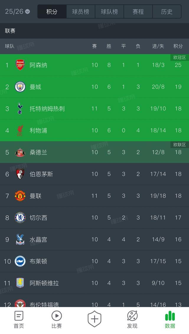 曼联在客场2-2战平热刺,目前热刺凭借净胜球的优势排在积分榜第二,利物浦、桑德兰、伯恩茅斯少赛一场同积18分,曼联则排在第七名。 本轮英超,利物浦将在客场挑战曼城,桑德兰则将在主场对阵榜首阿森纳,伯恩茅斯将对阵排在第11名的阿斯顿维拉。 【上咪咕独家看英超】 |