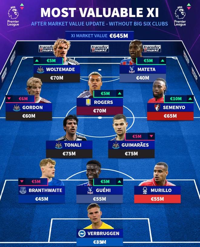 门将 巴尔特-费布鲁亨(布莱顿)3500万欧元 后卫 穆里略(诺丁汉森林)5500万欧元、格伊(水晶宫)5500万欧元(+500万欧元)、布兰斯韦特(埃弗顿)4500万欧元(-500万欧元) 中场 吉马良斯(纽卡斯尔联)7500万欧元(-500万欧元)、托纳利(纽卡斯尔联)7500万欧元、塞门约(伯恩茅斯)6500万欧元(+1000万欧元)、摩根-罗杰斯(阿斯顿维拉)7000万欧元(+500万欧元)、安东尼-戈登(纽卡斯尔联)6000万欧元(-600万欧元) 前锋 马特塔(水晶宫)4000万欧元(+500万欧元)、沃尔特马德(纽卡斯尔联)7000万欧元(+500万欧元) 总身价:6.45亿欧元 【上咪咕独家看英超】 |