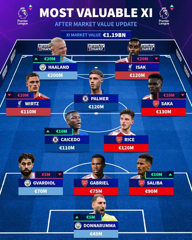 门将:多纳鲁马(曼城,4500万欧元) 后卫:格瓦迪奥尔(曼城,7000万欧元)、加布里埃尔(阿森纳,7500万欧元)、萨利巴(阿森纳,9000万欧元) 中场:凯塞多(切尔西,1.1亿欧元)、赖斯(阿森纳,1.2亿欧元)、帕尔默(切尔西,1.2亿欧元)、维尔茨(利物浦,1.1亿欧元)、萨卡(阿森纳,1.3亿欧元) 前锋:哈兰德(曼城,2亿欧元)、伊萨克(利物浦,1.2亿欧元) 【上咪咕独家看英超】 |