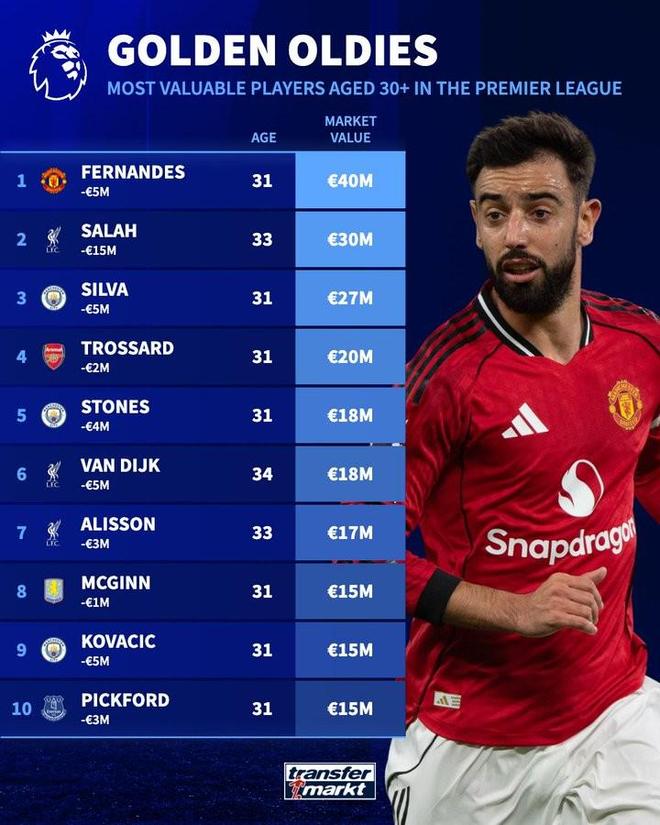 德转列英超30+岁球员身价榜:B费4000万欧居首,萨拉赫第二