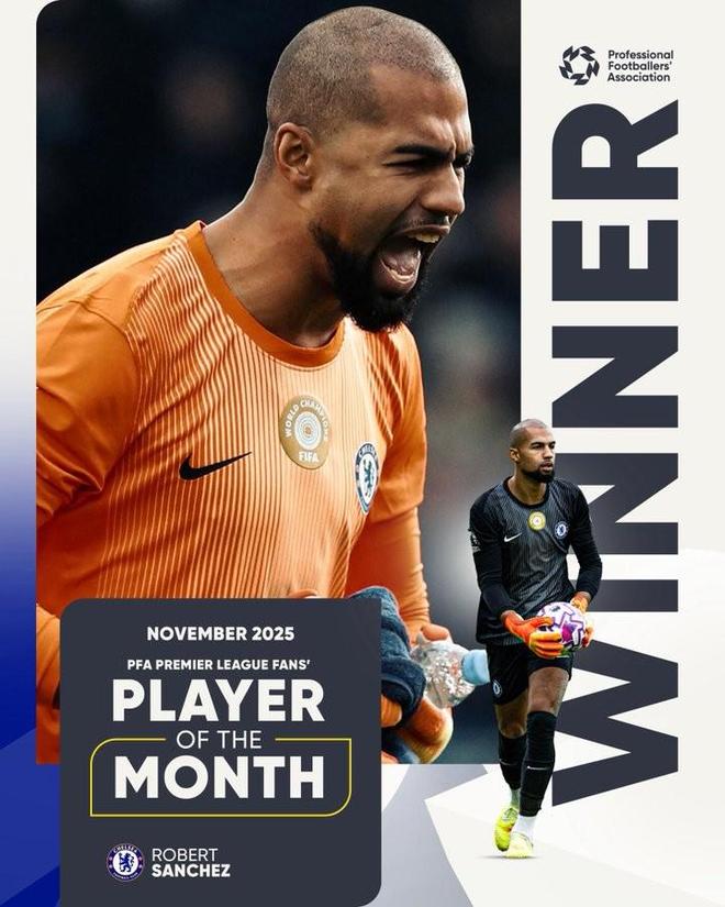 | 官方消息,切尔西门将罗伯特-桑切斯当选PFA(英格兰职业足球运动员协会)英超球迷评选的11月最佳球员。