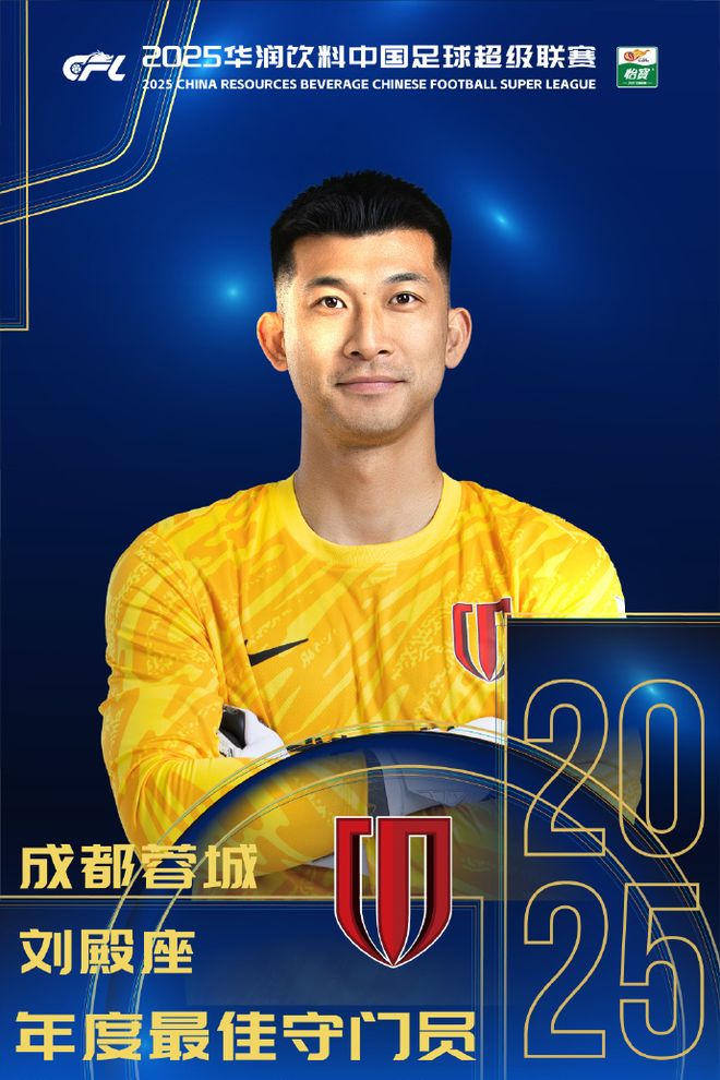 年度最佳守门员:刘殿座(成都蓉城) 本赛季,35岁的国门刘殿座为蓉城出战27场完成10次零封仅丢25球,扑救48次扑救,成功率63.16%。