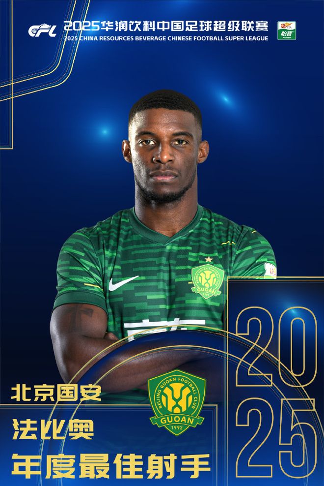 年度最佳射手:法比奥(北京国安) 2025赛季,32岁的法比奥30场中超全部首发,贡献28球4助,以1球的优势力压卡扎伊什维利,生涯首次斩获中超金靴。法比奥也帮助国安最终位列中超积分榜第4名,并且随队斩获足协杯冠军。