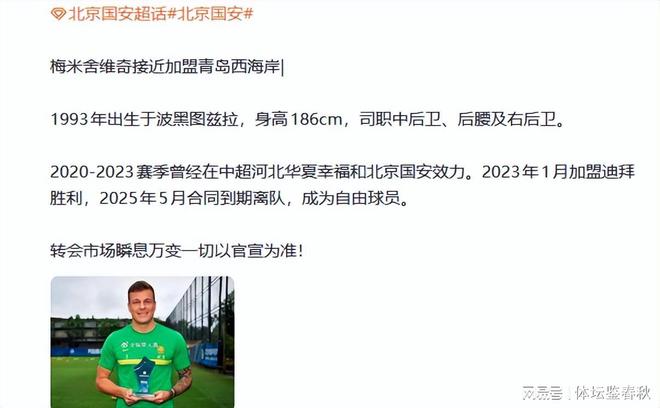 2022赛季结束后,梅米没能留在国安,离开中超加盟了阿联酋联赛的迪拜胜利。那次离队并没有太多告别仪式,却让不少国安球迷心里有点空。时间一晃到了2025年5月,他与迪拜胜利的合同到期,恢复了自由身。消息传回国内,很快就和多支中超球队产生了联系,目前走在最前面的,是青岛西海岸。 西海岸的情况,外界也不是完全不了解。作为中超新军,阵容经验和稳定性都存在一定的问题。梅米舍维奇这种踢过多年中超、熟悉联赛节奏、还能在多个位置即插即用的球员,正好是他们最需的类型。