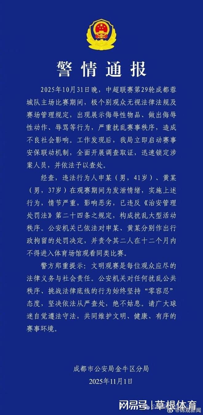 咎由自取!2名球迷观战蓉城vs河南扰乱秩序,被行政拘留+禁止观赛